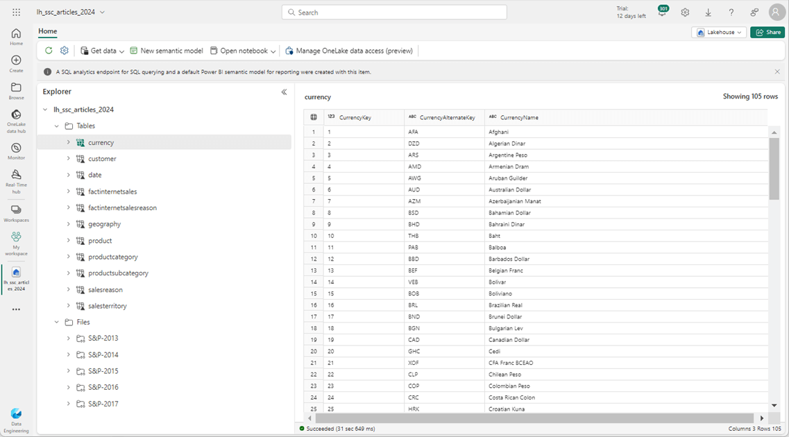 The quickest test is to use the GUI in Fabric to inspect the various shortcuts. The image below shows the data in the currency Delta Table from the Adventure Works database.