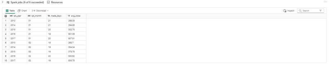 The output from the Spark SQL statement is shown below. This is a good test since we used all five File shortcuts and have read all stock data files.