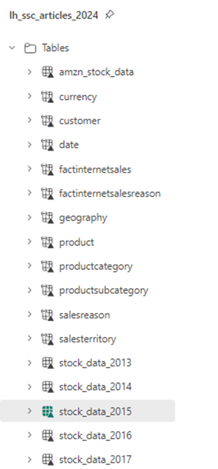 If we look at the Lakehouse Object Explorer, we can see 6 new tables have been created. I leave using the CTAS code to create tables for both Google and Microsoft as an exercise for the reader.