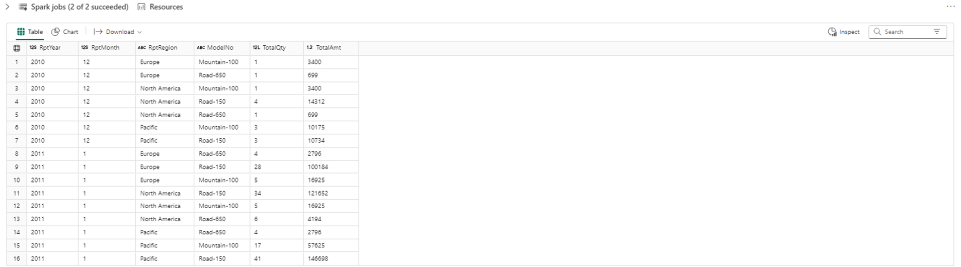 %%sql select CalendarYear as RptYear, Month as RptMonth, Region as RptRegion, Model as ModelNo, SUM(Quantity) as TotalQty, SUM(Amount) as TotalAmt from rpt_prepared_data group by CalendarYear, Month, Region, Model order by CalendarYear, Month, Region limit 16