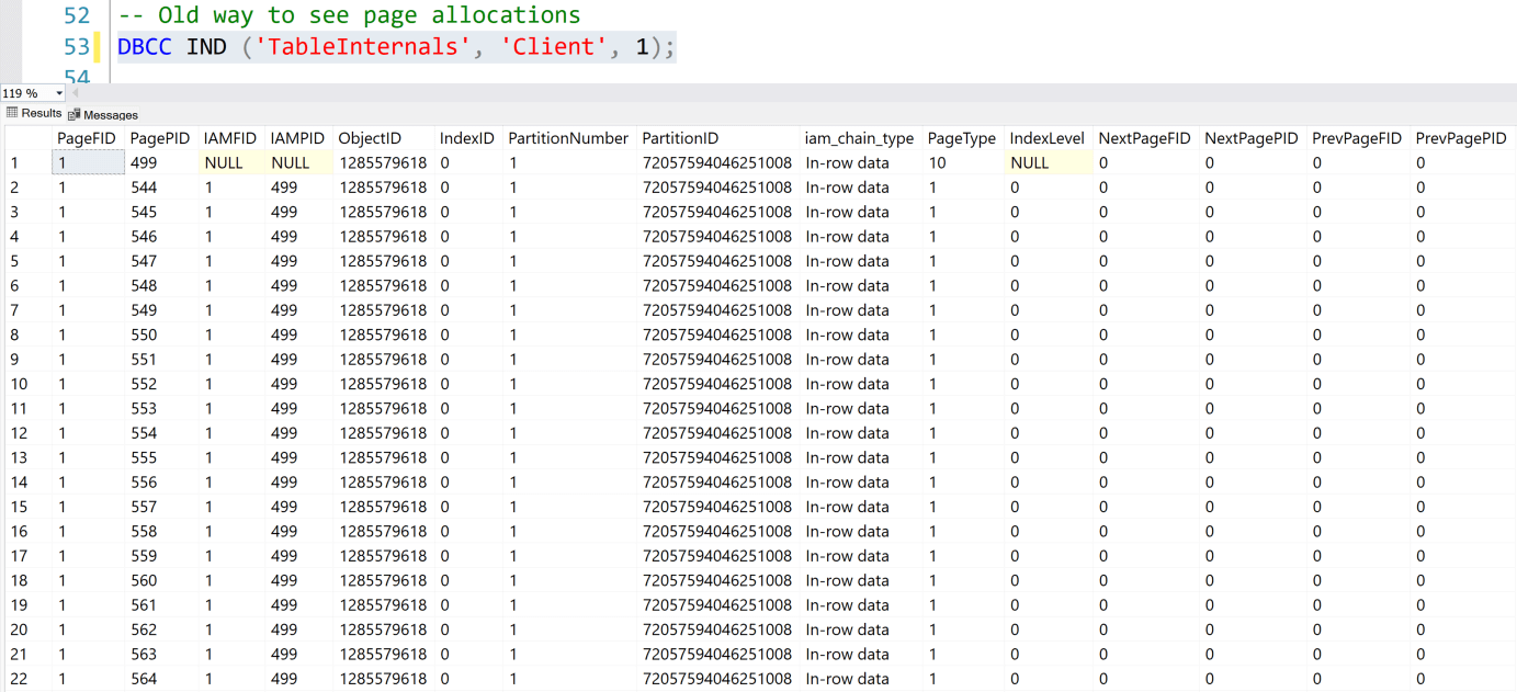 Note: As you can see, the number of columns in the results is a bit different, with the new method retrieving more columns/data compared with `DBCC IND`.
