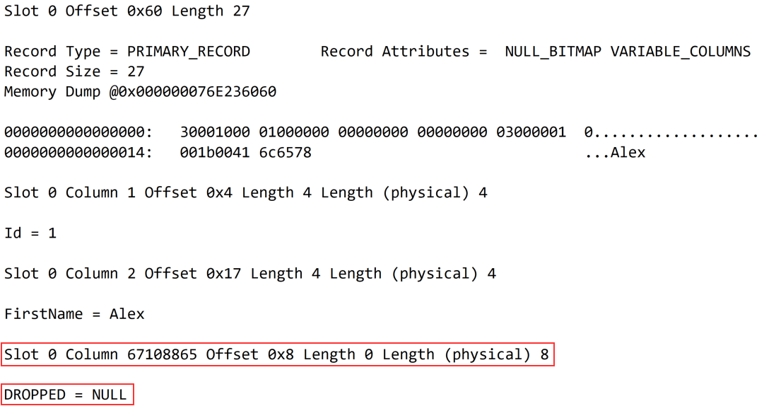 As I have mentioned before, we can now see that we had a column in a specific offset `0x8` which now has `Length 0` but the `Length (physical) 8` and what was before a `column name = datetime value` is now `DROPPED = NULL`.