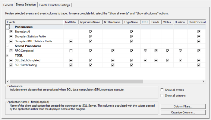 Lastly, for those die-hard “Profiler for Life” DBA’s there are traces you can add to capture this information as well. When creating the trace look under Performance and choose the follow.