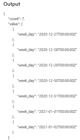 It successfully returns the output result of 7 days for the 1st week of 2021, starting from Sunday of 2020-Dec-27.