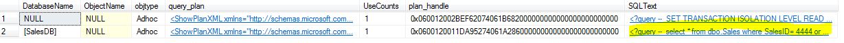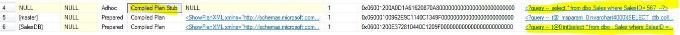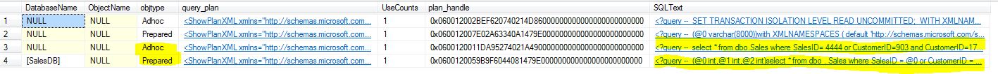 This time there are 2 "ad hoc" objects, but only 1 "Prepared statement" object whose "UseCounts" is 2 now. Because of this simple parameterization, SQL Server recognizes that the following two statements generate essentially the same execution plan and reuses the first plan for the second statement.