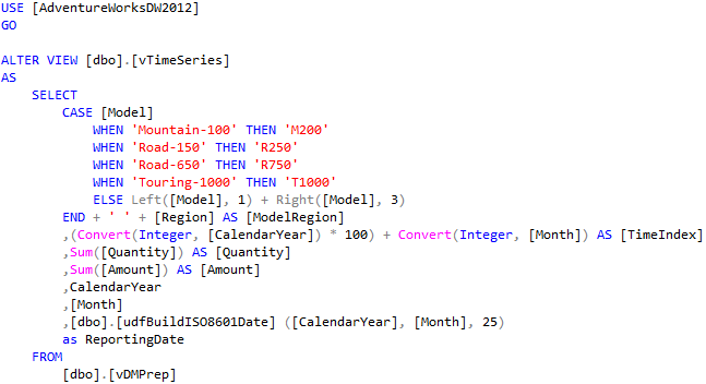 Let's take an example of the [dbo].[vTimeSeries] view from the [AdventureWorksDW2012] SQL Server sample database, more specifically the first section of the select statement with all the columns listed:
