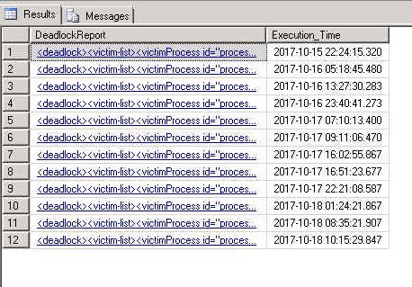;WITH SystemHealthAS (SELECTCAST ( target_data AS xml ) AS SessionXMLFROMsys.dm_xe_session_targets stINNER JOINsys.dm_xe_sessions sONs.[address] = st.event_session_addressWHEREname = 'system_health')SELECTDeadlock.value ( '@timestamp', 'datetime' ) AS DeadlockDateTime, CAST ( Deadlock.value ( '(data/value)[1]', 'Nvarchar(max)' ) AS XML ) AS DeadlockGraphFROMSystemHealth sCROSS APPLYSessionXML.nodes ( '//RingBufferTarget/event' ) AS t (Deadlock)WHEREDeadlock.value ( '@name', 'nvarchar(128)' ) = N'xml_deadlock_report'ORDER BYDeadlock.value ( '@timestamp', 'datetime' );