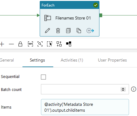 Where Items parameter is set to @activity('Metadata Store 01').output.childitems.