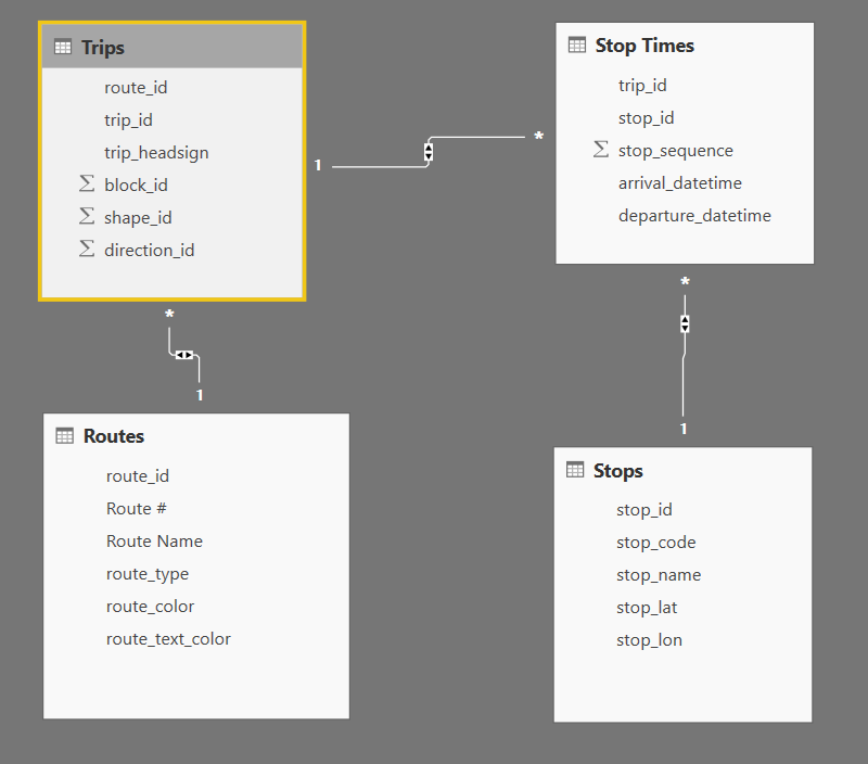 I pulled an opened dataset of TTC Routes and Schedules with the route definitions, stop patterns, stop locations, and schedules of the Toronto TTC ground buses and streetcars into my Power BI data model.