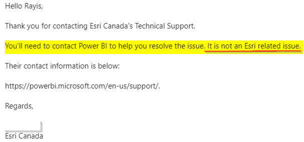 But then I received a response from the Canadian Tech ESRI support team on my request to look into the issue of non-connectivity to Plus subscription content in Power BI. Basically, it communicated that all things were OK with the map itself and I needed to check further with Microsoft Power BI support team.