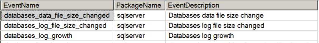 /* Let's take a look at the columns available for each of the events picked out */ SELECT * FROM sys.dm_xe_object_columns WHERE object_name = 'databases_data_file_size_changed' AND column_type != 'readonly'; SELECT * FROM sys.dm_xe_object_columns WHERE object_name = 'databases_log_file_size_changed' AND column_type != 'readonly'; SELECT * FROM sys.dm_xe_object_columns WHERE object_name = 'databases_log_growth' AND column_type != 'readonly';