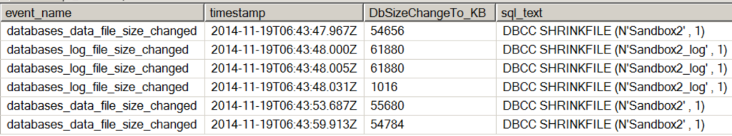 Check that out! We have captured the shrink events too! There are multiple shrink events in this case only because I ran the shrink statements multiple times. This is excellent news for everybody that is trying to keep an eye on these database size changes. You can see in the XE session that I applied the sql_text() action. I have done this so I will be able to see what query caused the growth or shrink event to occur. Even better news is that this event session is perfect for those of you still on SQL 2008.