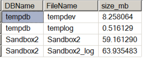 WHERE database_id in (2,DB_ID('Sandbox2'));I didn’t post the numbers earlier for my files for the Sandbox2 database, but they were small. I had a 2MB data file and a 1mb log file. Now, when I look at the results from that last query that included the file size information, I will see a database that has grown a fair amount.
