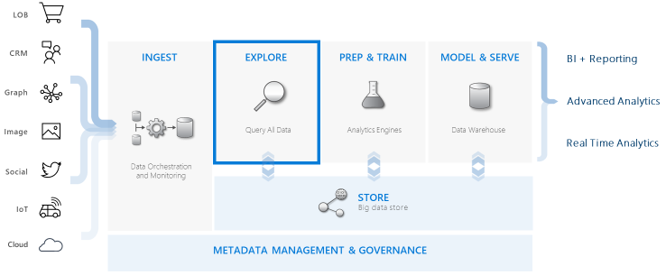 Azure Data Explorer integrates with other major services to provide an end-to-end solution that includes data collection, ingestion, storage, indexing, querying, and visualization. It has a pivotal role in the data warehousing flow by executing the EXPLORE step below on terabytes of diverse raw data.