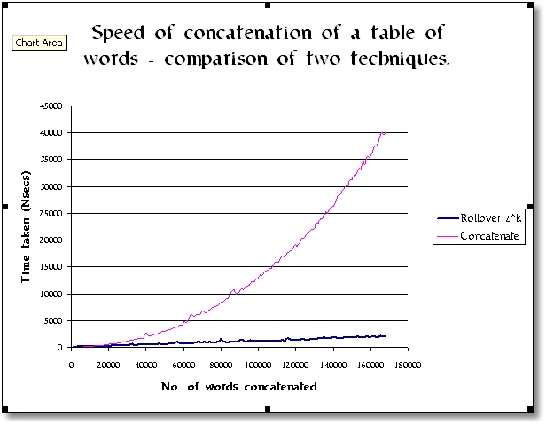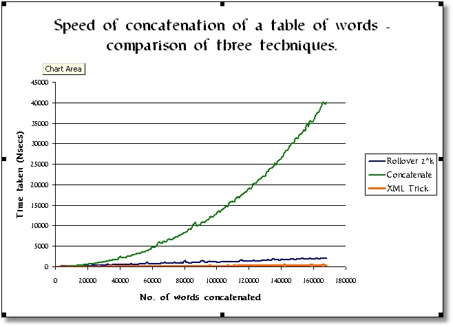 Stop press! Already, Barry is onto something very useful. I haven't worked out a way of putting a graph into a comment so I'll add this to the original post. I've no re-run the tests by doing a comparison between a simple concatenation and Barry's Rollover 2^k technique. Barry's trick wins hands-down, and is showing significant gains even in modest concatenation operations.