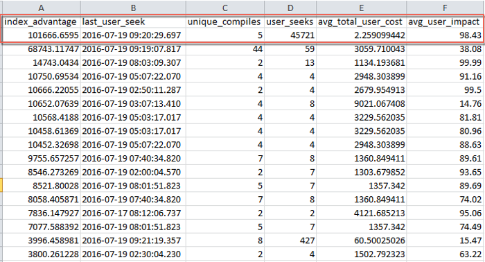 Now just because these scripts stated they were missing I didn’t just create them; I evaluated their usefulness and determined if they were worth the extra storage space and overhead. Glenn’s script gives you a lot of information to help decide on the index effectiveness. As you can see with the first one in the result set, if the index was added over 45,000 user seeks would have utilized it and query cost would drop on average by 98.43%. Again I didn’t arbitrarily add this index because it was in the list. Once I determined I would not be creating a duplicate or similar index on the table and given the potential of better performance with the suggested index, it was added.