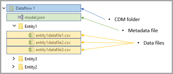 The following diagram shows a sample CDM folder in ADLS Gen2, created by a Power BI Dataflow, that contains three entities: