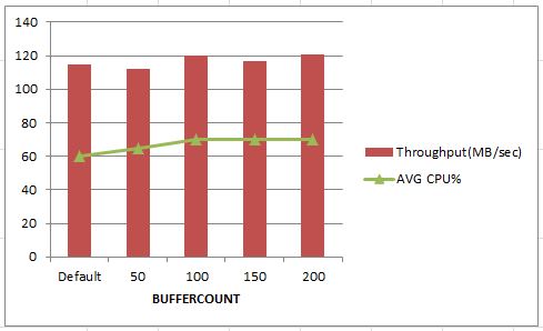 based on the diagram upper, when BUFFERCOUNT = 100, Throughput reach the ceiling, comparing with the first command without BUFFERCOUNT parameter(default), we made the backup process 30% faster.