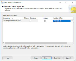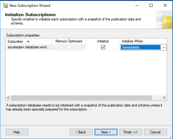 8. Initialize subscriptions In this step you will specify if your subscription will be initialized after finalizing the wizard steps or if you want to do it later. My recommendation do it Immediately, there are just few scenarios where you need to do that later.