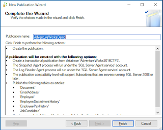 9 Confirmation In this step it shows you the summary of what you have chosen, but it is also an important step, where you will be giving the name to the publication so you can identify later what is it about, this is incredibly useful when you have several replications configure in the same server, or when you have 2 or more publication from the same database that each serves for different purposes (Reports, DR, etc.)
