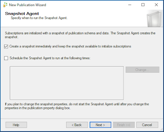 6 Snapshot Agent Each publication has its own snapshot agent, this agent will be the one in charge of generating the schema to be applied on each of your subscriptions, you can choose to generate the snapshot immediately at the end of the wizard or schedule it to run at a given time. You can also choose both, in the case that you would like to reinitialize your subscriptions at a given day of the week although for transactional replications that is not recommended.
