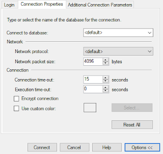 Step 5.2 To take advantage of the containment, you will need to select directly the database that you want to connect, you can do this by clicking on the "Options Button" at the bottom right corner of the screen, the logon window will change, so then you will need to go to the Connection Properties tab and in the "Connect to Database" section, you will need to write the Database name, it shows the option to lookup, however if you are not logged in it will tell you that you need to login first and you will end up in a circle where you can't authenticate, so better write down the database name so you can enter it here.