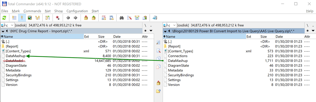 In Total Commander, explore the .zip files side by side as seen below. When you explore the contents of the .zip files, you can see the components of the Power BI Desktop files. On the left I have the first file with the imported data model. On the right I have the Power BI Desktop file with the Live Query connection.