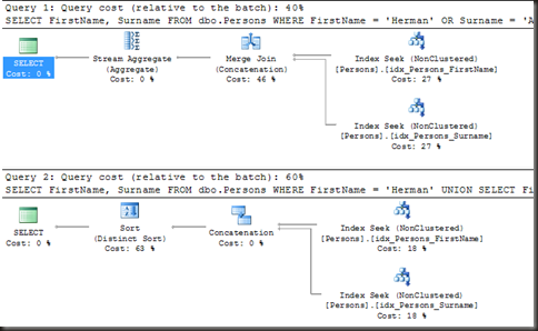 In this case, the OR can be replaced with a UNION and the results are the same. The Union form is slightly less efficient according to the execution plan’s costings (60% compared to the OR at 40%), and the two queries have the same general form, with two index seeks and some form of concatenation and remove duplicates.
