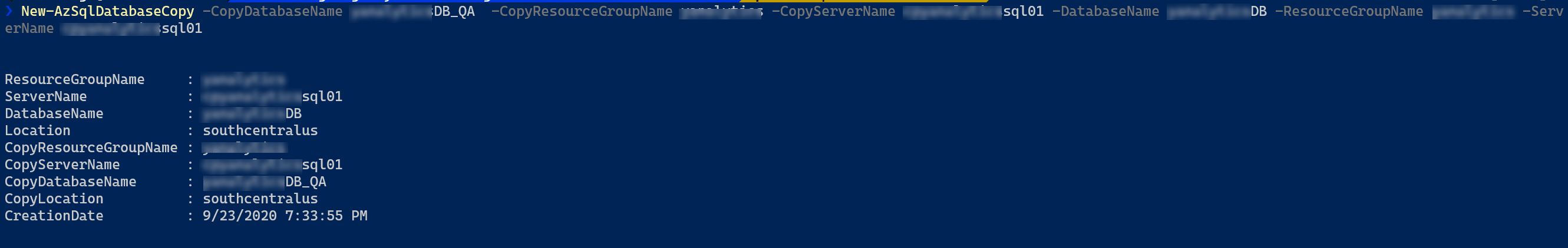 New-AzSqlDatabaseCopy -CopyDatabaseName demodatabase_QA -CopyResourceGroupName "demo-rg"-CopyServerName demoazuresql01-DatabaseName demodatabase -ResourceGroupName "demo-rg" -ServerName demoazuresql01