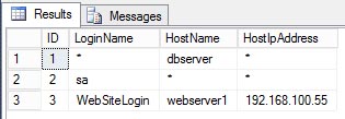 Line 1 has an asterisk for LoginName and HostIpAddress. This means that any login from any IP address is allowed to connect as long as the HostName is dbserver. Line 2 has an asterisk for HostName and HostIpAddress. This means the sa login is allowed to connect from any hostname or IP address. Line 3 is the example we used above. An asktrisk in all three columns would allow any login from any hostname or IP address to connect.