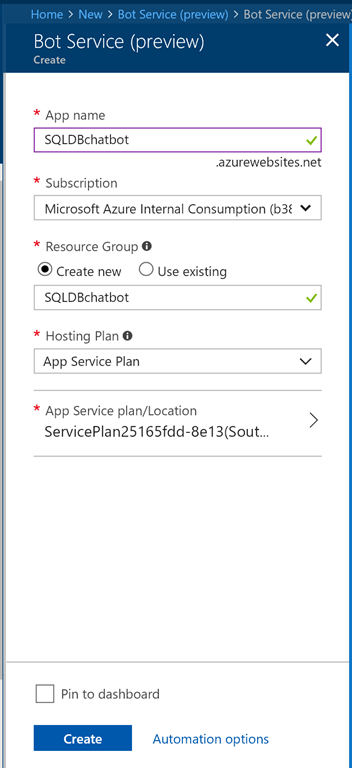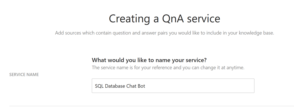 When you click Create new service, you’ll need to first name your service. I’m calling this bot SQL Database Chat Bot.