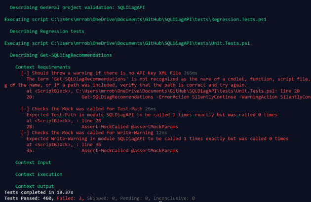 To check that the PowerShell code that I had written conformed to the Script Analyzer rules. I added an exception to the Help.Exceptions.ps1 file to not run the rule for plural nouns as I think the command has to be called Get-SQLRecommendations with an S ! I have tagged the ScriptAnalyzer Tests with a tag so I can just run those tests.