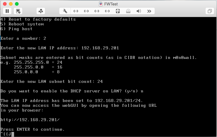 After the last interface has been added, press <Enter> to indicate you’re finished. Review your work, then enter y to reboot and save the configuration.