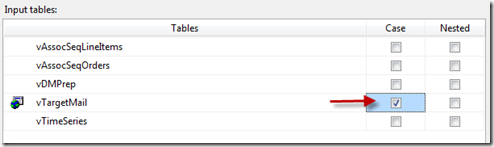 7 .Place a check under input next to the following columns: Age, Commute Distance, Gender, House OwnerFlag, Mairtal Status, NumberCarsOwned, NumberChildrenHome, Region, TotalChildren, and Yearly Income. Next->