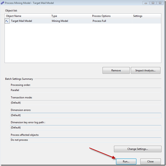 You have now created the Mining Structure and a Mining model using the Decision Tree Algorithm. Now it is time to process and deploy the model. Click on the Mining Models Tab and view the Model. Notice the Bike Buyer is set to Predict Only and the Customer Key is the Key. The rest of the columns are set to input.