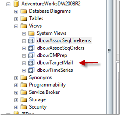 The Adventure works data base comes with views that are already set up to perform data mining. Let’s take a look at one of these views. Open the Target Mal view by right clicking on it in SSMS and select Design.