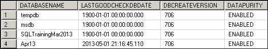 For upgraded databases, We need to run below DBCC command on database & In case DBCC CHECKDB with DATA_PURITY got completed successfully, a bit dbi_dbccFlags will be flipped from 0 to 2. Now from future onwards data purity is enabled by default for upgraded databases as well & it will be performed each time DBCC CHECKDB runs.