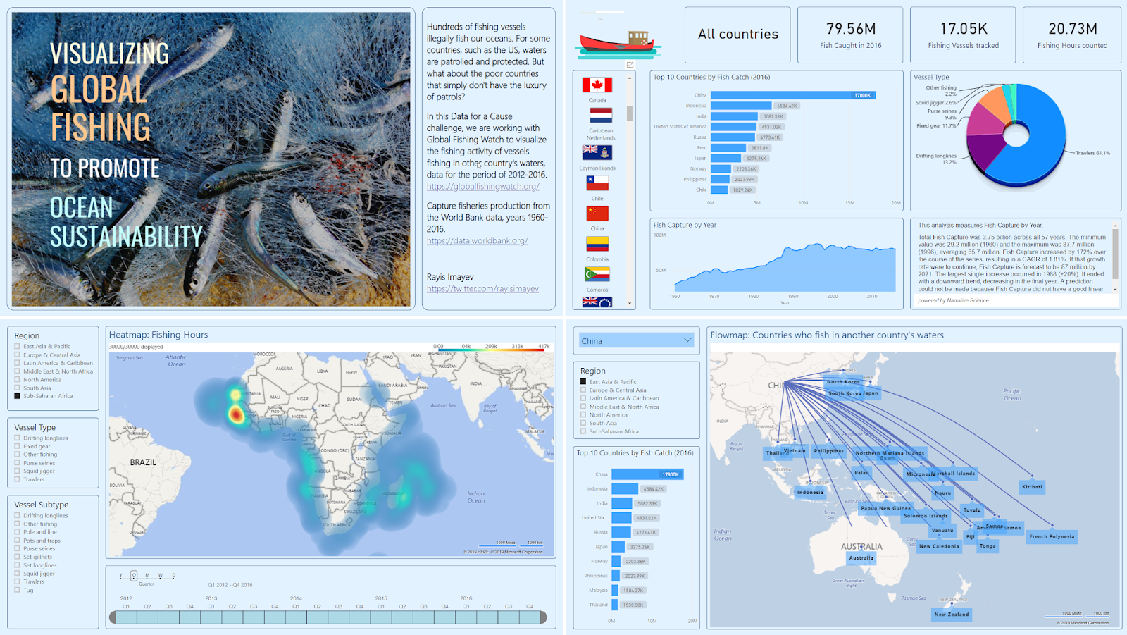 - I hope that this Power BI report does help to analyze fishing activities in the world. And if you are aware of other nonprofit organizations that I can help with this type of data analytics, please let me know, it would be my way of giving back to the community.