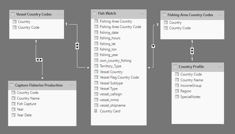 Eventually, after pulling data from the main data file, Wikipedia county codes list and fish capture data, my final data model in Power BI looked the following way, where I replicated the county code table both for Vessel & Fishing Area country info.