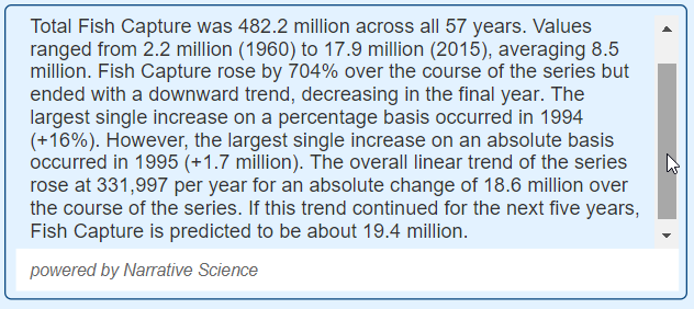 - Narrative Science for Power BI component to create natural language narratives based on fish capture time series. I really liked this component in Power BI since it allows me to automatically and interactively generate a textual description of my numeric data, it also helps to show any potential trendlines in my dataset. And I had already blogged about this Narrative Science component for Power BI in the past: http://datanrg.blogspot.com/search?q=narrative+science.