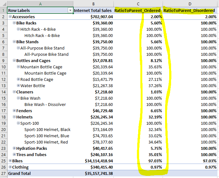 However, when I looked at the results for this new RatioToParent measure using Excel, I saw some weird values: only the to Category level showed me correct calculations and all other Product hierarchy levels had 100%.