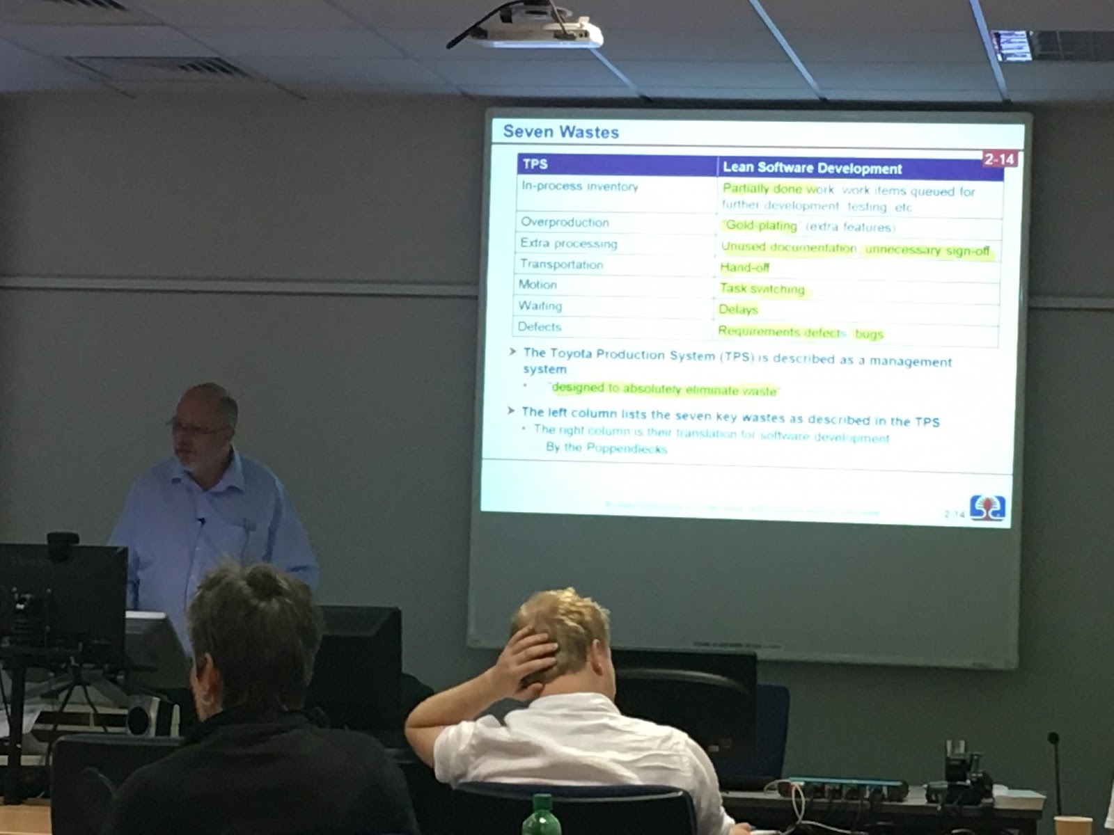 15:20 Lean, Kanban and the seven wastes are next up. Getting examples of waste from attendees environments.