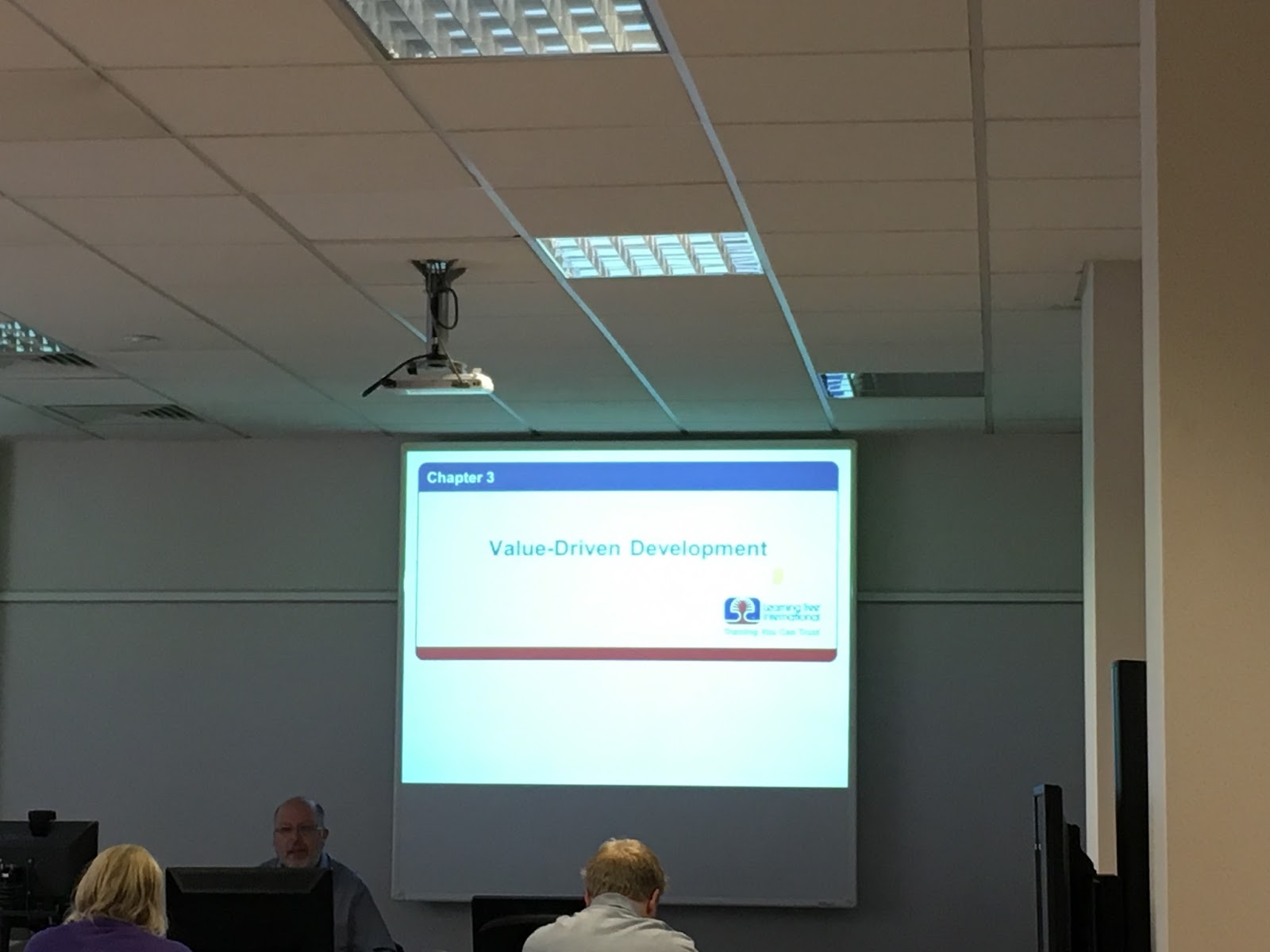 09:00 We are starting Day 2 at Chapter 3: Value-Driven Development. Talking about the Iron Triangle of Scope, Cost and Time