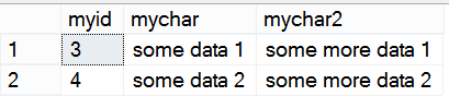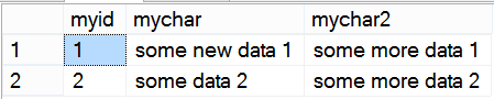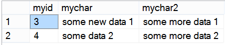 INSERT INTO dbo.myTable1(mychar, mychar2) VALUES('some data 1', 'some more data 1') INSERT INTO dbo.myTable1(mychar, mychar2) VALUES('some data 2', 'some more data 2') set mychar='some new data 1' SELECT * FROM dbo.myTable1 Here’s the Output from our SSMS Windows.