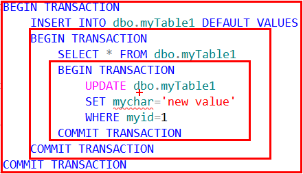 INSERT INTO dbo.myTable1 DEFAULT VALUES So we’ve covered Implicitand Explicit, now we get to Nested. Nested Transactions are multiple levels of Explicit Transactions.