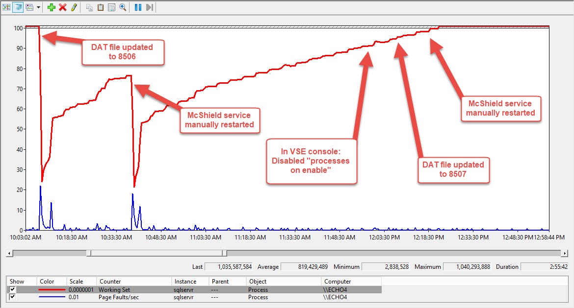 The red line is the Working Set of SQL Server and the blue line is the Page Faults/sec for SQL Server. The first dip in the red line was from the DAT file update, and the second dip was when I manually restarted the McShield service. Since SQL Server’s buffer pool had just been paged out, it needed to read those pages from disk which results in a page fault.