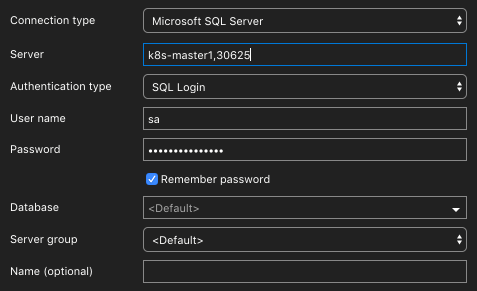 Anthonys-MacBook-Pro:~ aen$ sqlcmd -S k8s-master1,30625 -Q “SELECT @@SERVERNAME” -U sa -p