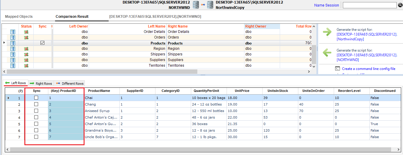 To demonstrate this, below are the comparison results for the Products table of two Northwind databases (NORTHWND and NorthwindCopy). The Products table in the NORTHWND database does not have products with ID 8 to 14. The Products table in the NorthwindCopy database does not have products with ID 1 to 7. Also, the data for the product with id 20 is different in the NorthwindCopy database. A row is considered different if that row exists on both tables with the same primary key and at least one of the other fields is different. The goal here is to copy products with ID 8 to 14 and the changes in the product with ID 20 from the NorthwindCopy to NORTHWND. This means that xSQL Data Compare needs to generate a script for the left database (NORTHWND) where only the different and new rows from the right database will be synced. These rows will be left checked.