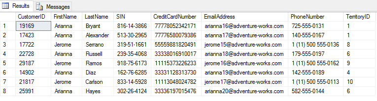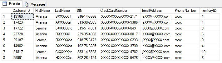 INSERT INTO [Customers] VALUES('19169','Arianna','Bryant','816-14-3866','77778052342171','arianna16@adventure-works.com','725-555-0131',1) INSERT INTO [Customers] VALUES('17423','Arianna','Alexander','513-30-2965','77776580079386','arianna17@adventure-works.com','140-555-0167',1) INSERT INTO [Customers] VALUES('17722','Jerome','Serrano','319-51-1661','55559881820491','jerome15@adventure-works.com','1 (11) 500 555-0136',8) INSERT INTO [Customers] VALUES('22728','Arianna','Russell','239-35-4068','33338016910017','arianna18@adventure-works.com','179-555-0197',6) INSERT INTO [Customers] VALUES('29187','Jerome','Ramos','918-75-6173','11115373226233','jerome16@adventure-works.com','1 (11) 500 555-0162',9) INSERT INTO [Customers] VALUES('14902','Arianna','Diaz','162-76-6285','33331128313730','arianna19@adventure-works.com','142-555-0189',4) INSERT INTO [Customers] VALUES('21817','Jerome','Carlson','833-14-5928','11113048024782','jerome17@adventure-works.com','1 (11) 500 555-0113',10) INSERT INTO [Customers] VALUES('25991','Arianna','Hayes','302-26-4124','33336197015476','arianna20@adventure-works.com','582-555-0144',6) A user with db_owner permissions can view the unmasked data but a user who isn’t a db_owner will see masked data so it is important that your database security has been properly designed. I know from experience that many developers simply give everyone db_owner permissions to ensure that all procedures and functions work correctly. This will need to be changed to use DDM effectively.