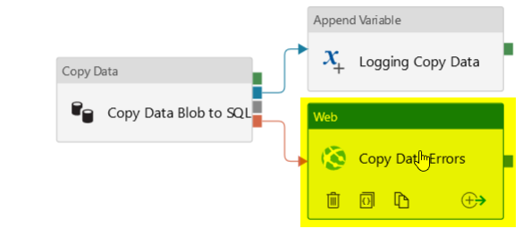 1) I open my pipeline "Load data into SQL" container and add & connect Web Task for a failed event from the "Copy Data Blob to SQL" activity task.